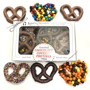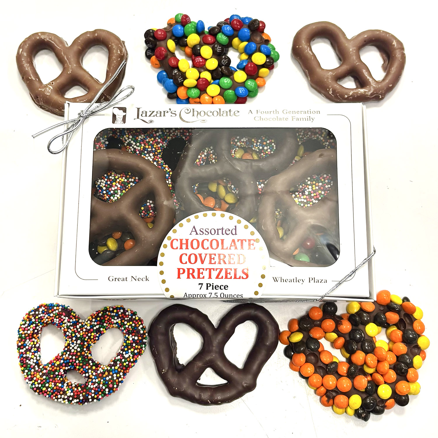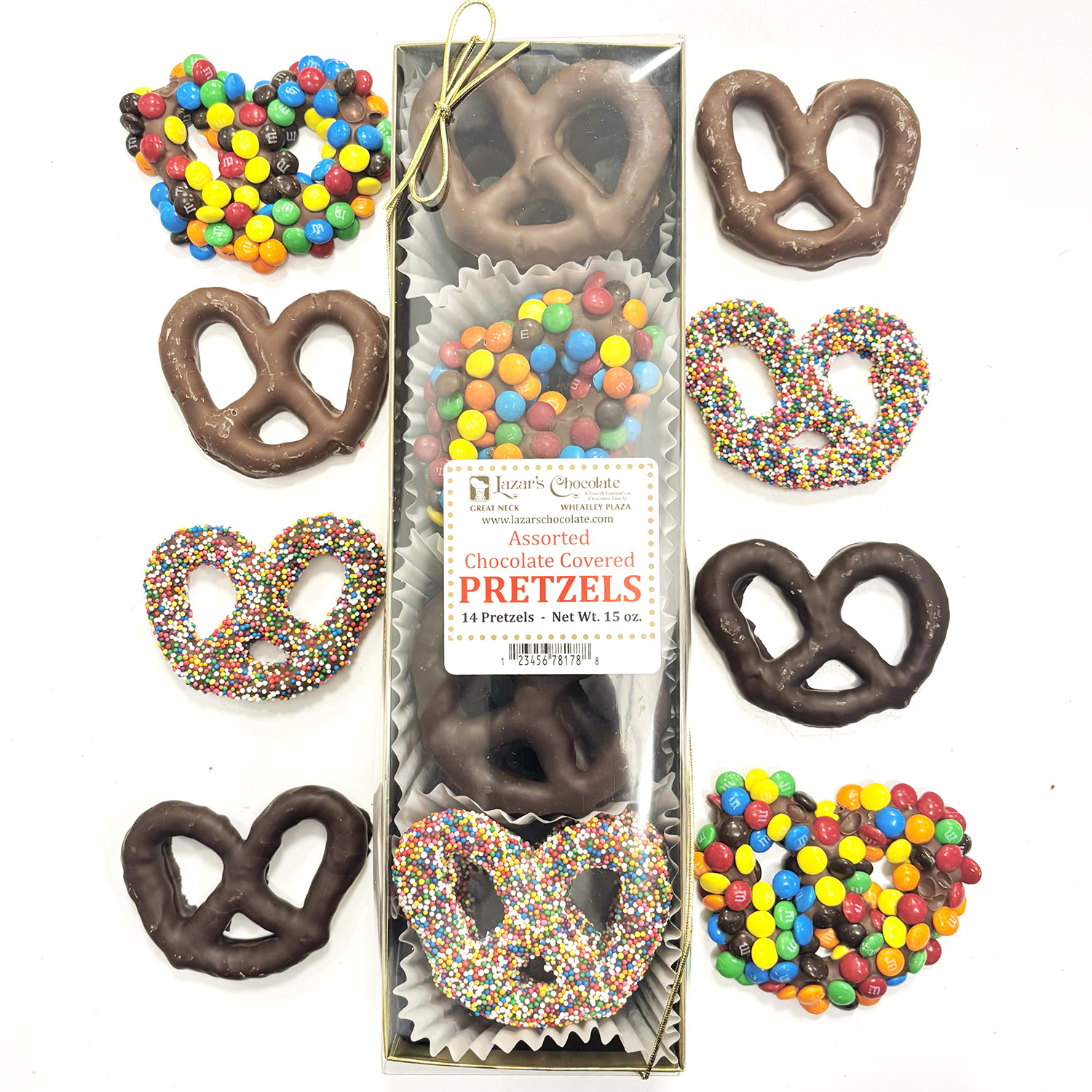 2 Sizes: 6 Piece Small Box & 15 Ounce Large Box. Chocolate Covered Pretzels: Non-Pareil, Milk, Dark & White
