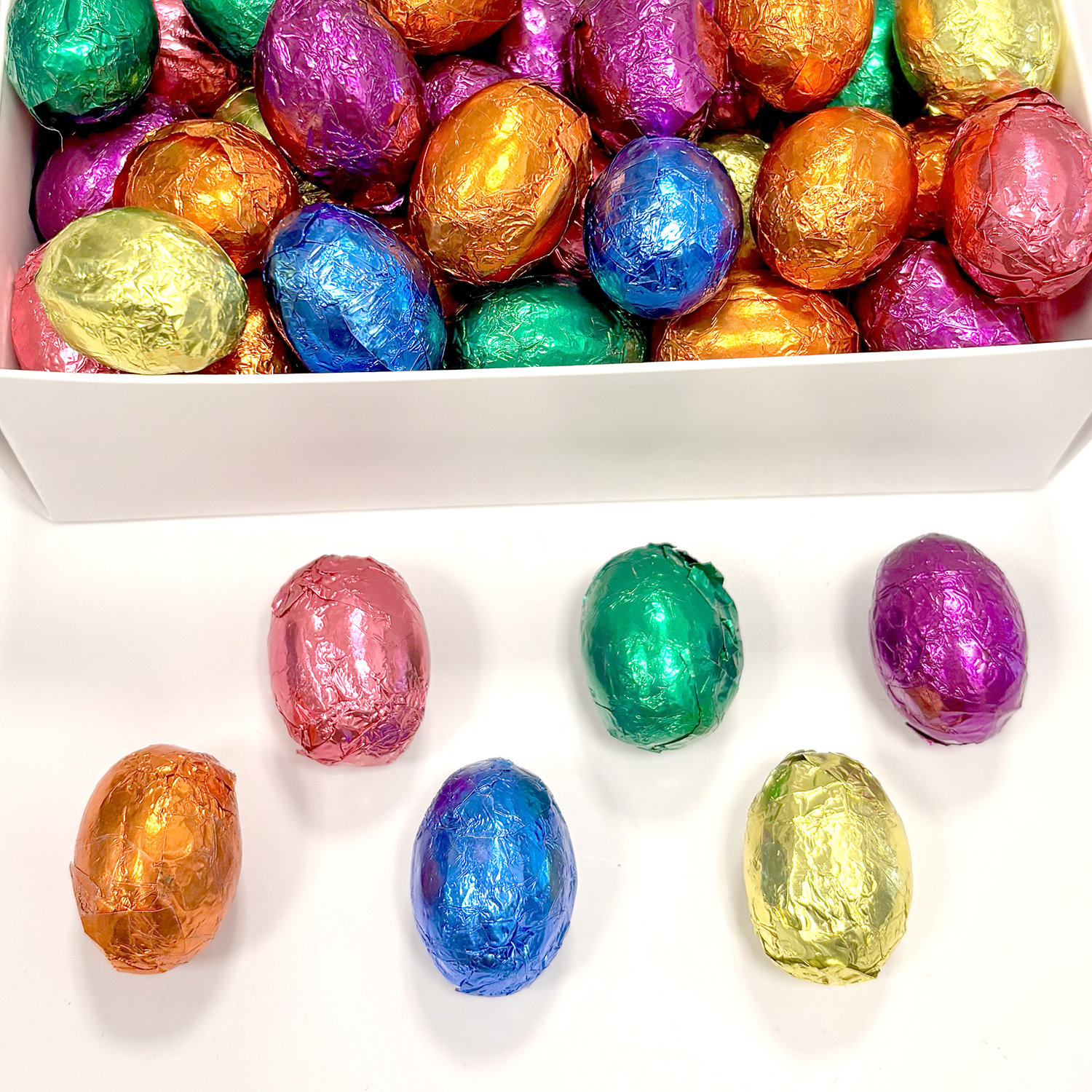 Hunting for Easter eggs has never been so scrumptious than with these solid dark chocolate eggs, made with our signature semi-sweet cocoa blend. These bite-sized miniature Easter eggs are wrapped with an assortment of metallic colors and feature a medley of spring-inspired pastel hues.